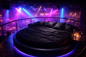 After recovering, we checked out the sex rooms upstairs, beds side by side with curtains you could see through. Then back downstairs to the lounge. A spot opened on the big white semicircular couch facing the impact area. We claimed the middle. Michele dead center like the Queen she is, Jon and I on either side. We sat there for a long time, sipping drinks, watching everything. It felt like we were the center of attention, even if we were not. Everyone passing by had to see us.